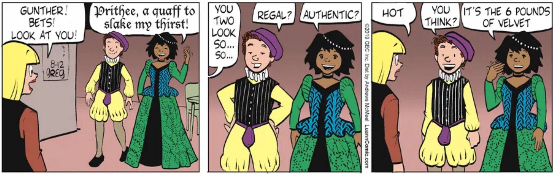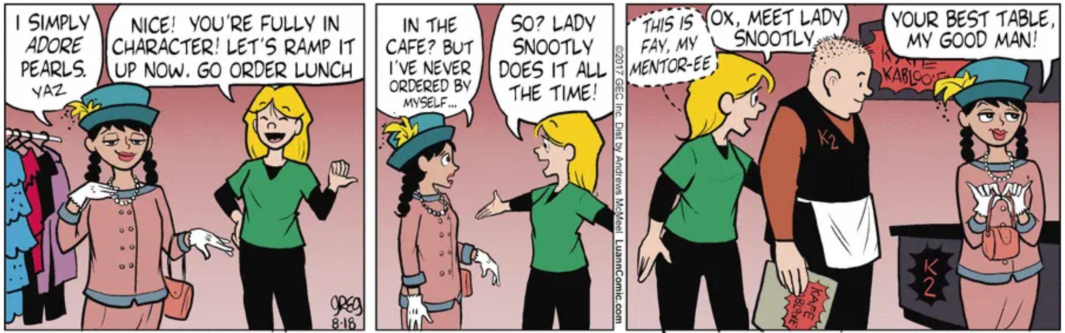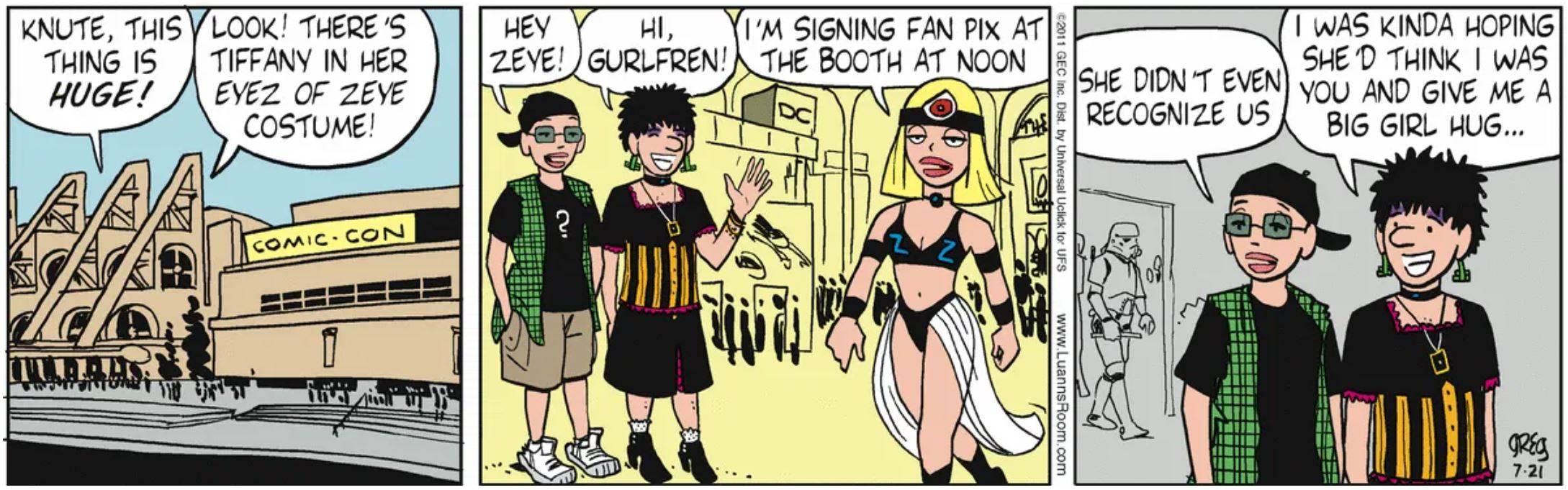 Dear Reader, What an awesome summer whirlwind we've had: first the LUANN exhibit opening at the Comic-Con Museum, then presenting as Special Guests and seeing fans for five days of Comic-Con, and finally off to Boston for the annual gathering and Reuben Awards with our peers in the National Cartoonists Society. Whew! We are ready to rest...and get caught back up on deadlines! THANK YOU to the fans who came to the Museum and found us at Comic-Con! We love seeing you in person and appreciate...