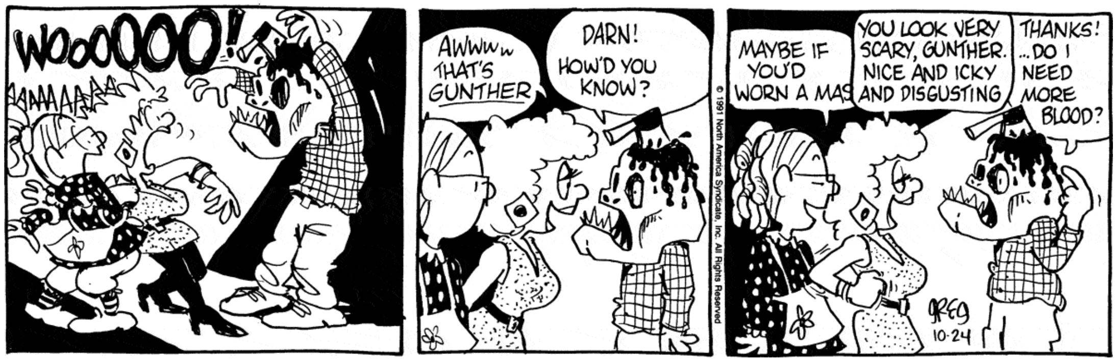 Costumes are drawing-intensive! If the Halloween storyline isn't essential, interesting, and worthwhile, the characters might as well be dressed in regular clothes, doing non-Halloween things.