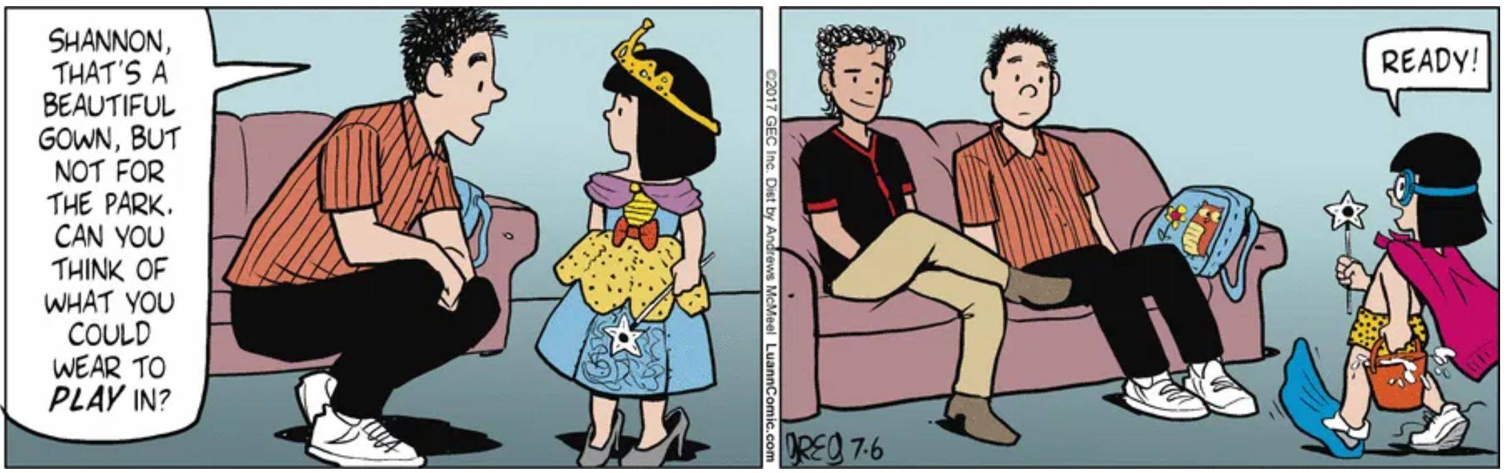 With Halloween around the corner, it's a fun time to imagine what else we could be: not just whether we could have been doctors, but what it would be like to be a dragon, a ghost, or an elven warrior. When he was little, Greg imagined himself as Superman...stoically leaping off the roof of the family's garage...and sloppily landing in a heap below. I, on the other hand, often imagined I was a horse, galloping wild and free all over the playground, pawing the ground and snorting. Maybe we didn't turn out quite the way we imagined, but we surely couldn't have imagined how interesting life would be with the LUANNiverse!